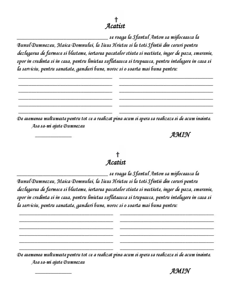 Viata este un dar, o binecuvantare de la dumnezeu. Acatist pentru izbavirea de boala; Rugăciune către maica domnului pentru vindecarea de boli. Doamne, cel ce ai zis ca nu cei sanatosi au nevoie de doctor, ci cei bolnavi, primind smerita noastra rugaciune care se aduce tie cu zdrobire de inima, vino cu puterea ta cea tamaduitoare si alina durerile robului tau care se afla in mare suferinta, trimitand peste noi harul tau cel curatitor, ca sa strigam:. De asemenea, părintele ilarion argatu , marele duhovnic de la cernica, îi sfătuia pe tinerii care nu se puteau căsători să citească, timp de 40 de zile, în fiecare seară acatistul sfinților părinți ioachim și ana și în fiecare dimineață acatistul sfântului nicolae.