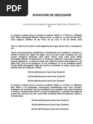07.03.2015 · de la:"natura divina" data:sâ 7 mar.. Rugăciune de dezlegare la blestem (letrină două rânduri) îndurate doamne, bunule şi iubitorule de oameni, care pentru îndurările tale ai trimis pe unul‑născut fiul tău în lume, ca să rupă zapisul greşealelor cel asupra noastră şi să dezlege legăturile celor legaţi de păcate şi să propovăduiască celor robiţi iertare, tu, stăpâne, şi pe robul tău (n) liberează‑l.