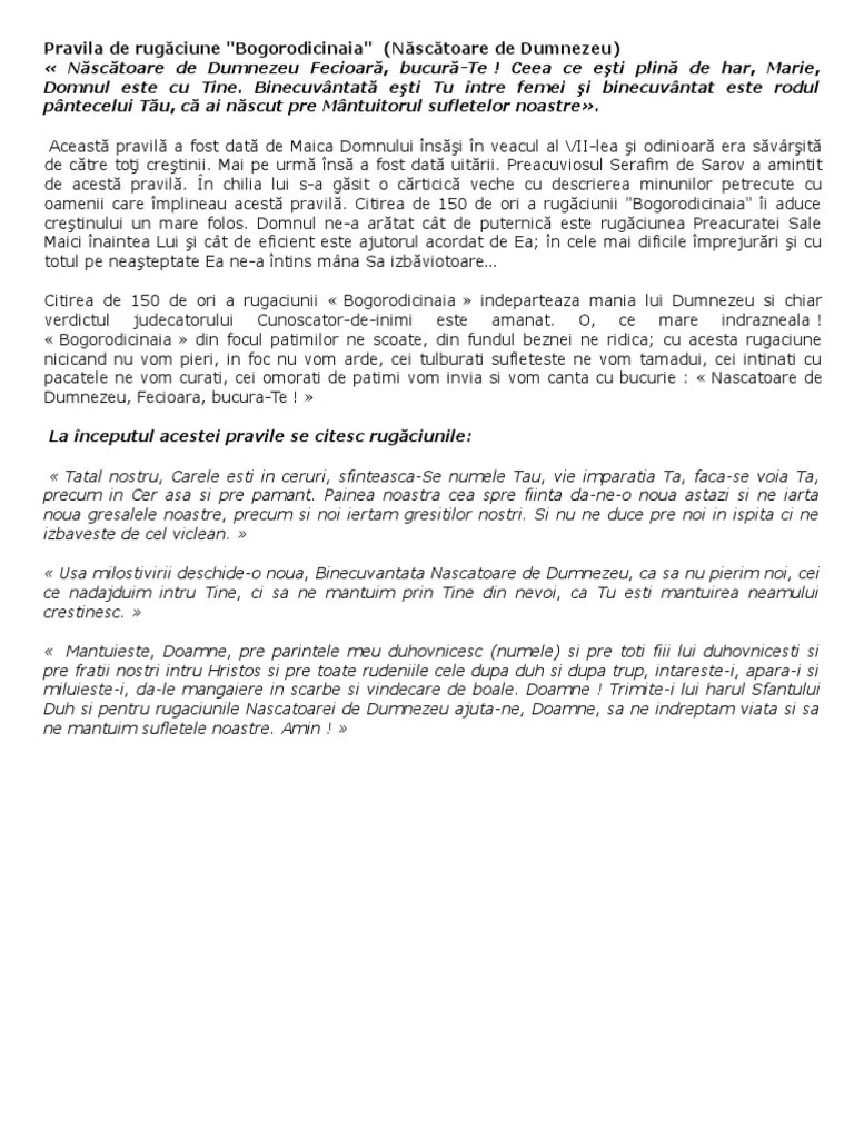 Binecuvântată ești tu între femei și binecuvântat este rodul pântecelui tău, că ai născut pre mântuitorul sufletelor noastre". Canon de rugaciuni a copiilor: Preasfanta stapana de dumnezeu nascatoare, primeste aceasta putina rugaciune si o du fiului tau si dumnezeului nostru, ca sa mantuiasca si sa lumineze, pentru tine, sufletele noastre (o inchinaciune). Psalmul 50 (al lui david) psalmul 56 (al lui david) psalmul 100 (al lui david) rugaciune catre domnul nostru iisus hristos (a celui intru sfinti parintele nostru ioan gura de aur, pe care o spunea in fiecare zi) rugaciune a sfantului isaac sirul:.. Primeşte, preabinecuvântată şi preaputernică stăpână, de dumnezeu născătoare fecioară, aceste rugăciuni, pe care le aducem ţie acum cu lacrimi noi, nevrednicii robii tăi, ce înălţăm cu umilinţă cântare înaintea icoanei tale celei de tămăduiri purtătoare ca.